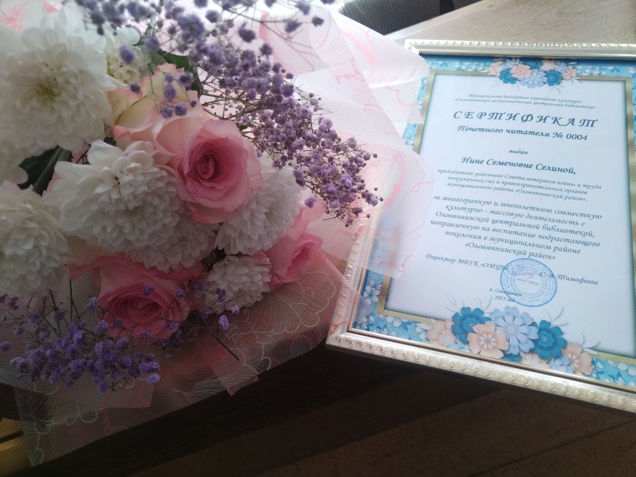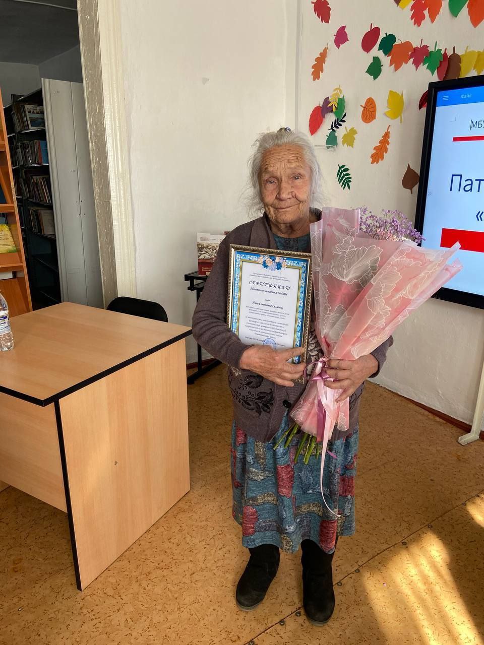 Трогательным и историческим моментом стало вручение Сертификата почётного читателя за номером 0004 - Нине Семёновне Селиной.