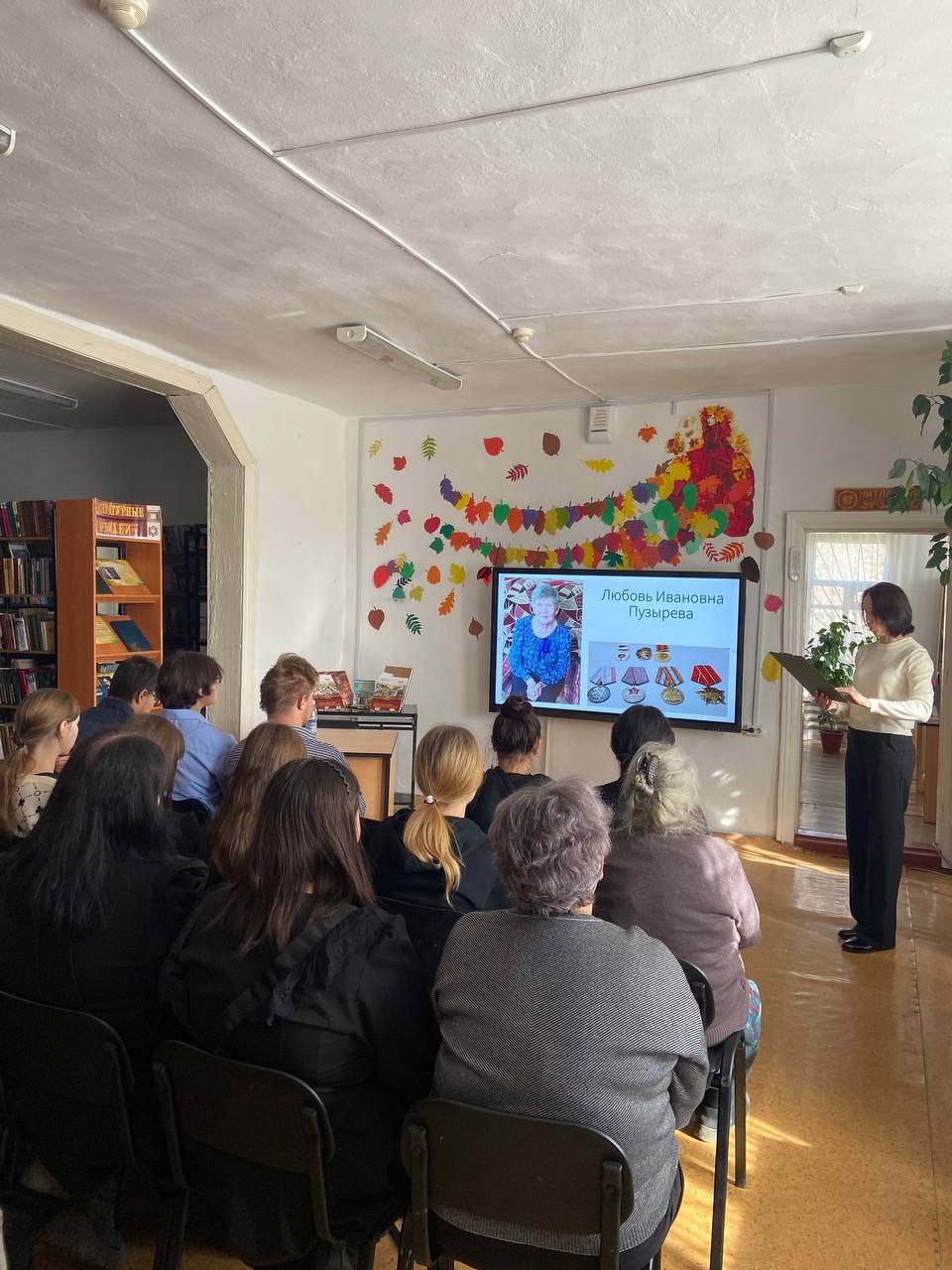 Библиотекарь зачитала воспоминания Любови Ивановны Пузыревой. Любовь Ивановна подробно описала свои воспоминания. В 1941 году, когда началась война, ей не было и 6 лет. Она помнит все — и голод, и холод. Любовь Ивановна имеет правительственные награды. История Любови Ивановны затронула до глубины души всех присутствующих.
