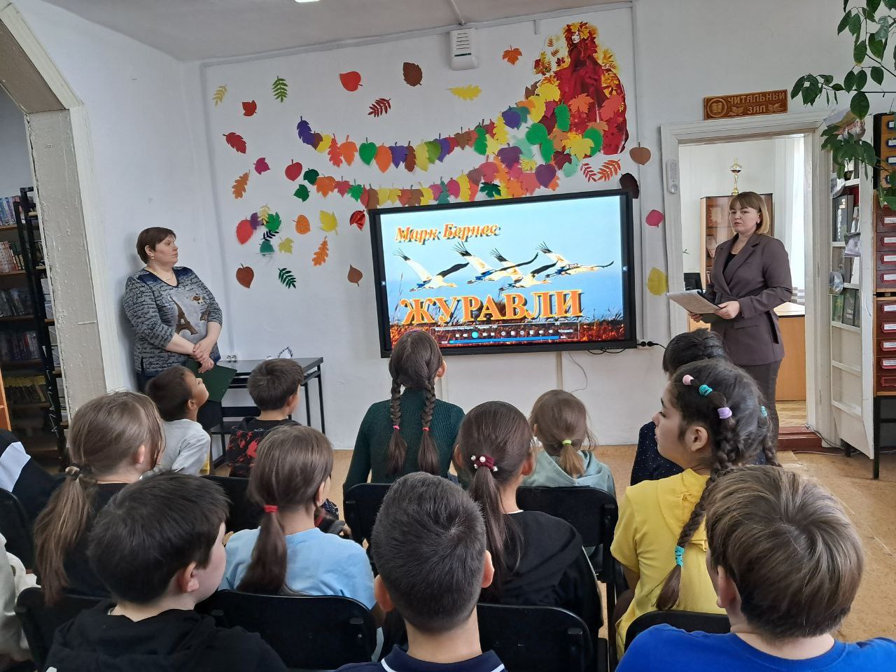 Библиотекари рассказали детям об истории возникновения этого праздника и о стихотворении "Журавли", которое оказало огромное влияние на искусство. Это стихотворение, написанное Расулом Гамзатовым, было замечено Марком Бернесом, для которого война была глубоко личной темой. Марк Бернес обратился к Яну Френкелю с просьбой написать музыку на эти строки. Так появилась знаменитая песня "Журавли", ставшая символом памяти о погибших в войнах.