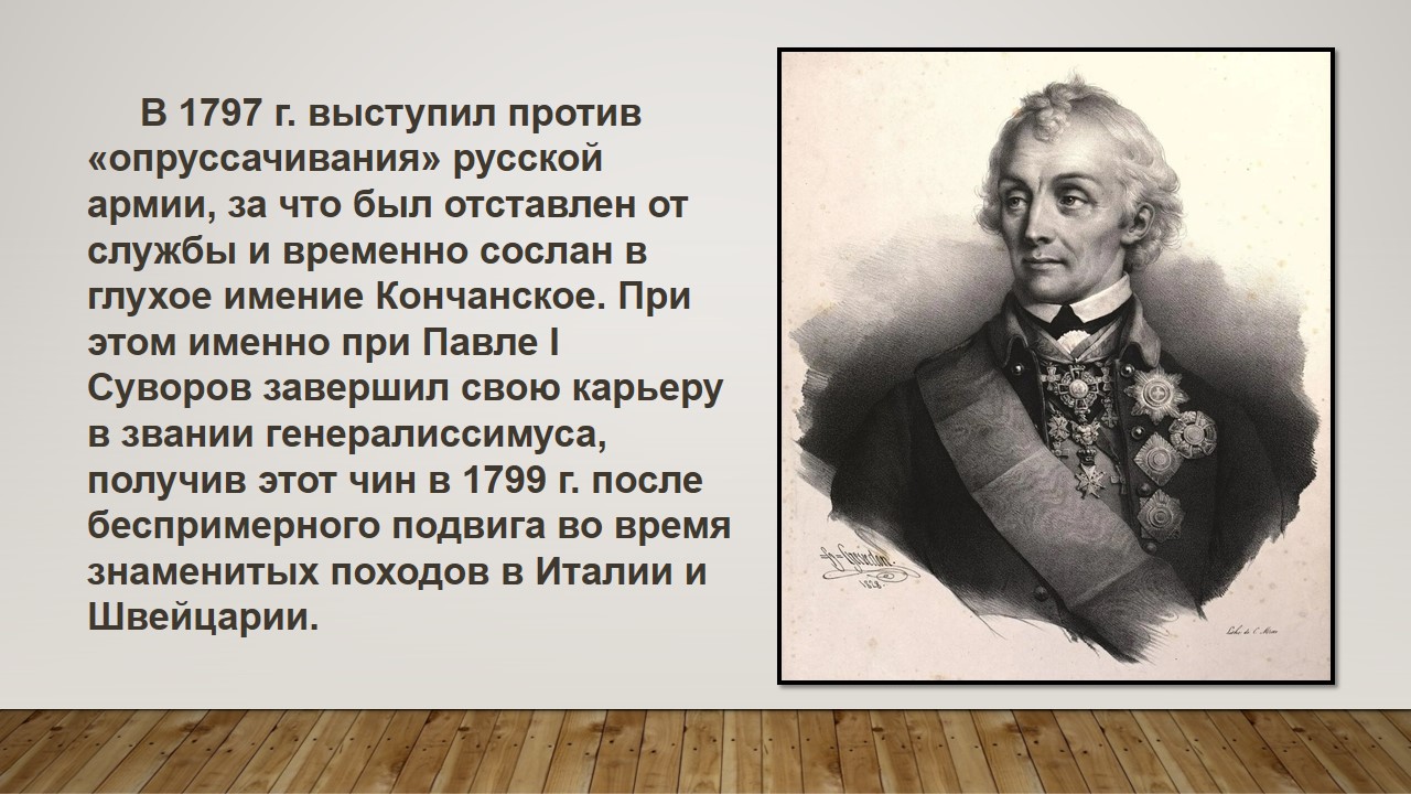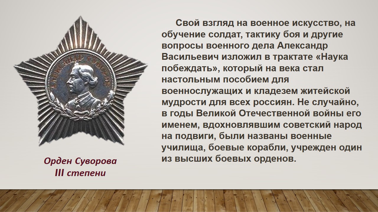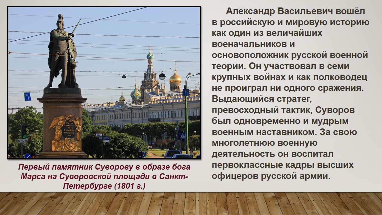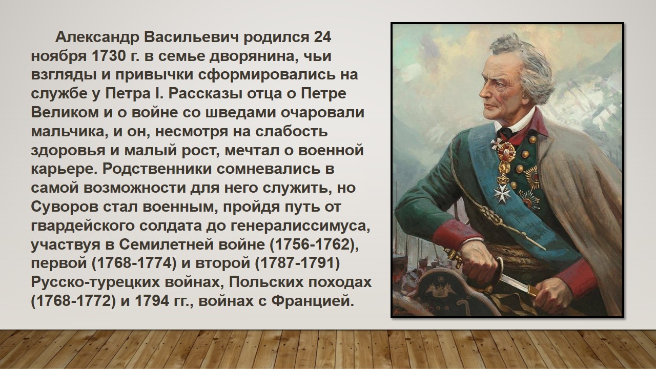 Александр Васильевич вошёл в российскую и мировую историю как один из величайших военачальников и основоположник русской военной теории. Он участвовал в семи крупных войнах и как полководец не проиграл ни одного сражения. Выдающийся стратег, превосходный тактик, Суворов был одновременно и мудрым военным наставником. За свою многолетнюю военную деятельность он воспитал первоклассные кадры высших офицеров русской армии.