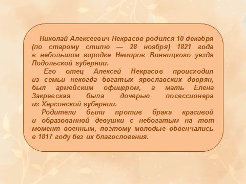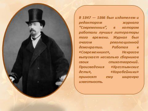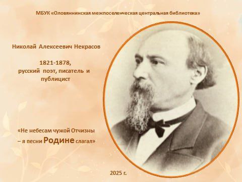 Николай Алексеевич Некрасов — русский поэт, писатель и публицист, классик русской литературы. Родился 10 декабря 1821 года в городе Немиров Подольской губернии, скончался 8 января 1878 года в Санкт-Петербурге в возрасте 56 лет.