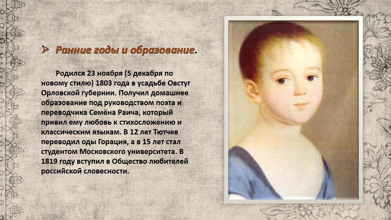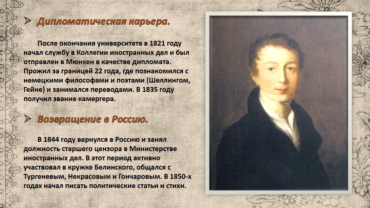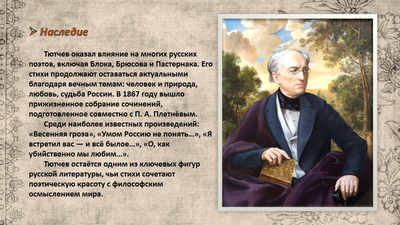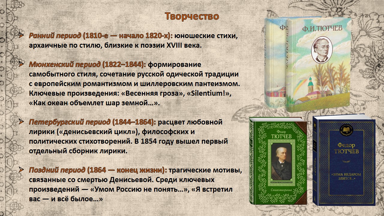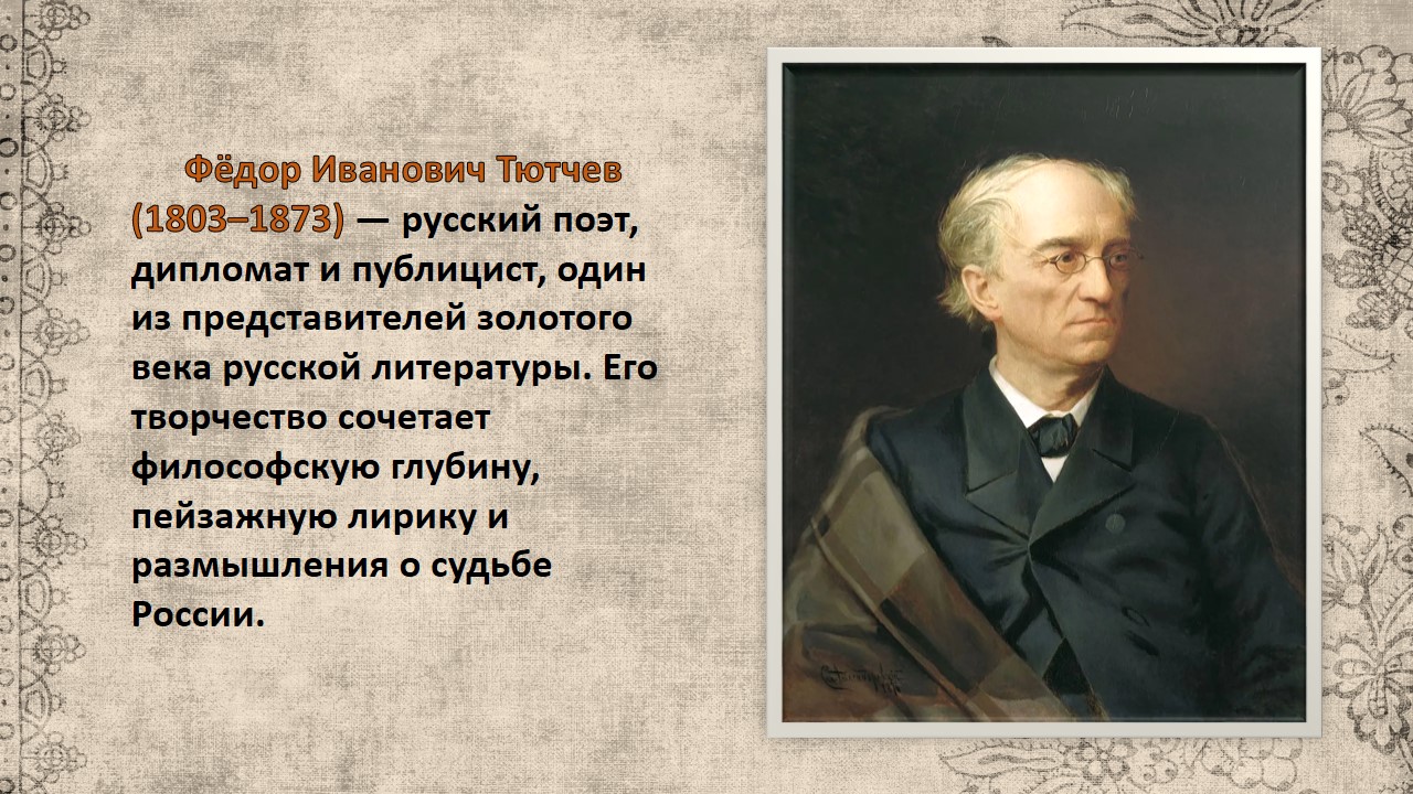 Фёдор Иванович Тютчев (1803–1873) — русский поэт, дипломат и публицист, один из представителей золотого века русской литературы. Его творчество сочетает философскую глубину, пейзажную лирику и размышления о судьбе России.